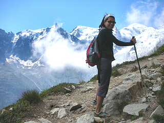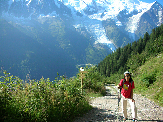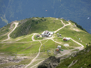 became edible with enough beaujolais sauce. We left Lyon Thursday morning and took the train four hours east up into the Alpes arriving at Chamonix around 1:00 PM. At the tourist information center, we found a hotel in the center of town and checked into The Hotel Croix Blanche. We spent a couple hours exploring the village and ate lunch at one of the many outdoor cafes. We spent the afternoon discussing what we wanted to do over the next few days. Friday morning we got up early and set out to hike up Le Brevent, the 2525 meter peak which rises on the opposite side of the Chamonix valley from Mt. Blanc. We started hiking at 7:30 AM and took about three hours hiking up through the forested mountainside to reach Planpraz, terminus of the lower gondola and a popular launching point for parasailers. The views of Mount Blanc and the Aiguille du Midi across the valley with a dozen colorful parasails peppered above the village were fantastic.