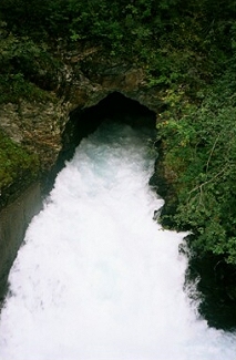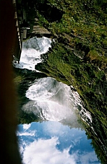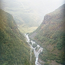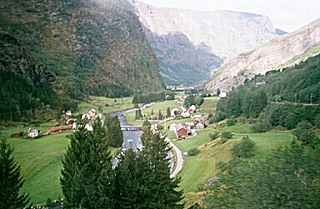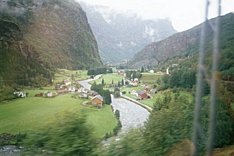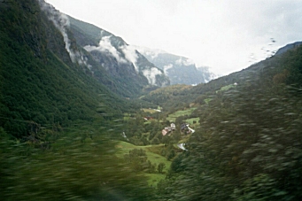 After the tour, I spent an hour on the Internet, then bought some food and went back to my hotel. Saturday, August 31, 2002 The weather is still gloomy and my cold is no better so I checked out of the hotel and went to the train station to head for Flam. As I was leaving my room, I noticed that one of the amenities provided to all guests was an umbrella. When I got to the station, there was a train about to leave, so I quickly got a reservation, collected my luggage, and jumped on board just before the doors closed. The ride to Myrdal (where I would change trains for Flam) took 1-¾ hours. I checked most of my luggage at the Myrdal station and waited about an hour for the train to Flam. This route is one of the most beautiful in the world. The train passes through 6,000 meters of tunnels during the 20 km descent, crossing the river three times. There are scores of waterfalls, which all seem to flow over flat rock, making the entire length of the waterfall visible as it cascades down the mountainside. The village of Flam itself is nestled between large mountains at the end of Aurlandsfjord a finger of the Sognefjord, the worlds longest and deepest fjord.