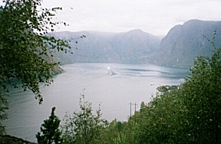 There were many cyclists on the route, but not many hikers. The Flam valley is spectacular and I got many great photographs of waterfalls and mountains. The final 2 km is a series of 17, 100 meter switchbacks that lead up to the Myrdal station. It had taken me only four hours to get to the top, and I only had to wait 15 minutes for the train back to Flam. I had a late lunch at an outdoor cafeteria and watched the cruise ships depart. After lunch, I returned to my hotel, did some laundry and decided to turn in early to try to fight my cold. If I have not improved by tomorrow, Ill start taking the special ($15/pill) antibiotics I have if I get a cold while on an expedition. Im sure I will be able to get the prescription refilled when I get to Copenhagen drug capital of the world. Monday, September 2, 2002 Im feeling a little better now that Im on the antibiotics. I should probably stay in bed today, but it is my last day, and I wanted to hike down to Aurland, the next major town on the fjord.