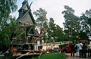 Friday, August 30, 2002 Bergen was the capital of Norway in the Middle Ages and is currently Norways second largest city. In the 15th to 17th centuries, German Hansa merchants operated a trading station in Bergen and came to control the dried fish trade. After breakfast at my hotel, I took a walking tour of Bryggen (the wharf area), the site of the original settlement of Bergen. The town has burned down, in whole or in part, thirty times since its founding in the 10th century. The museum has a large display of old fire fighting equipment and a pictorial history of some of the fires. The rain is continuing and my cold has gotten worse. If the weather does not get better, I may go on to Flam tomorrow and stay in a hotel there for a few days to try to get rid of my cold in a less expensive environment. In the afternoon I took a three-hour bus tour of various sites in Bergen and the surrounding area. The tour guide spoke in Norwegian, Dutch and English, repeating the same information three times, resulting in wasting 2/3s of everyones time. Highlights of the tour were a Stave church (one of 28 left in the world) and the home of Edvard Grieg, a Norwegian composer.