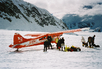 sun, which doesn't set until after 11 pm and comes back up at around 3 am.. My trip begins tomorrow with breakfast at The Roadhouse in Talkeetna where I meet the other people on the Alpine Ascents team. I feel as ready as I can be and hope that the weather, which has been warm and raining, will freeze up so the glacier is not too soft to walk on. SUNDAY, JUNE 2, 2002 Today I met three of the instructors at breakfast—Alan who works in the office, and Jon and Eric who will be guiding our trip. After breakfast we rode around and picked up the other people who will be spending the week with us. Once we had picked up all six students, we went to the Alpine Ascents area for a gear check, then out to the airport for our flight to the glacier. Our 11 AM take-off time was delayed because the landing area at the glacier was fogged in, so we went back to town for lunch. After lunch we headed back to the airport, but had to wait until after 4 PM for our turn to fly out. We passed the time learning knots, rope management and how to ascend out of a crevasse using prussic knots. Finally at 4:30 PM we