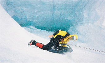 MONDAY, JUNE 17, 2002 We woke at midnight, ate breakfast packed our stuff and set off at 2:30 AM. Photos on roll #3 of camp at midnight and some stops on the lower Kahiltna Glacier as we made our way 5 miles to the base of ski hill where we will camp for 2 nights. We arrived at 7 AM. .![]() The crevasses are huge. We passed one that was only 6" wide but it ran the entire 4-mile width of the valley and we couldn't see the bottom. Other large holes appeared on both sides of the footprints we followed to camp one. There are avalanches every hour. Our plan is to carry a load up Ski Hill tonight then return for the rest our stuff. During dinner Monday at the foot of Ski Hill our tents blew away. We were able to catch it, but it reemphasized the importance of securing everything down.
