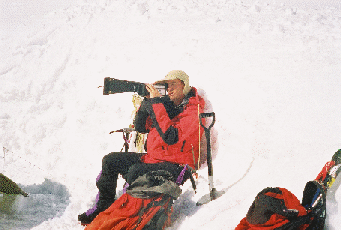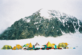 pick up the equipment and bring it up to 11,000'. We plan to be at 11,000' for at least 3 days, beginning our acclimatization. One of these days will include carrying half our stuff up to 13,500', then descending the same day. This way when we move the 14,000' in 4 days, we'll only have to descend 500' to pick up our stuff. Today started out cloudy but quickly developed into a full-blown storm. We heard thunder several times. We reached 11,000 at about 10 AM and set up our tents in the blowing storm. Now at 3:30 PM we've been resting in the tent for several hours listening to the storm rage outside. ![]() The 11,000' camp looks very crowded; I saw at least 50 tents on the way in. After the storm, two climbers from the Russian group. Mathew and Oleg come by to visit. There are 11 in their group including the two paraplegics. They were descending from 14,000' yesterday and lost a sled carrying 250 lbs of equipment, including their camera gear, cell phones and 2 satellite phones. They asked if they could use a phone to contact their friends in Moscow to let them know they were ok. They also wanted to know if we had any cigarettes or vodka. This Russian trip was an amazing expedition. They carried 3000 lbs of equipment and took 38 days to climb the mountain. THURSDAY, JUNE 20, 2002 This morning, Kirby told us that three brothers from Anchorage who had been climbing Mt. Foraker were killed in an avalanche. Also, higher on the mountain, there is a major rescue effort underway to save someone who fell 140'.