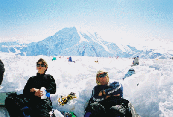 tent next to ours that has frostbite on his hand and may loose 3 fingers. It continues to rain sleet and snow day and night. The storm is inconsistent here in base camp but is producing 118-knot winds at 17,000’ camp and over a meter of new snow. As near as I can figure, Eric’s Alpine Ascent group is probably caught at 17,000’ camp. THURSDAY, JULY 4, 2002 Finally the weather breaks