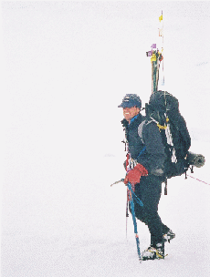 SUNDAY, JUNE 30, 2002 Today we slept until 11 AM then broke camp for the long journey back. Our plan was to climb down in one 24-hour period, stopping to pick up caches of equipment and trash as we went. We left at noon, reached the top of the Headwall by 2 PM and descended into 14,000’camp by 3 PM. I met Eric from Alpine Ascents who was guiding a climb up, and spent an hour reminiscing on the week we had spent as tent mates earlier in the month. At 5:30 PM we left 14,000’ camp to descend to 11,000’ camp where we had planned to rest until midnight to give the Kahiltna Glacier time to freeze up, making it a safer to travel across. We are all very tired and have multiple injuries to feet and muscles. MONDAY, JULY 1, 2002 After resting and eating at 11,000 camp, we collect the gear and start for Base Camp at 12:30 AM. Each of us has a full pack and sled, which weigh about 100 lbs. The glacier is very soft and the trail is difficult. After several hours, we decide to put on snowshoes which makes travel slower, but protects us from ‘post holing" every third step. By 4 AM we had reached 7800’ camp and continued on without stopping. It is sleeting now and difficult to see. At 7 AM we had reached the bottom of Heartbreak Hill with less than a mile (uphill now) to go to Base Camp. At the is point, Phil announces that he can’t possibly go any further and wants to set up tents there on the glacier to rest further. After a half hour wait, we convince him to go on and we proceed up the hill arriving in Base Camp at 8:45 AM. The landing strip is fogged in so no planes will be able to come to pick us up. We decide to pitch tents to wait for the weather to clear. We are in our tent all day and no planes can land, so we spend another night on the glacier. TUESDAY, JULY 2, 2002 and WEDNESDAY, JULY 3, 2002 Two more days spent in our tents at base camp waiting for planes that never arrived. We learned of another