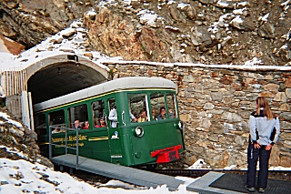 the final tram stop and the beginning of the traditional trail up Mont-Blanc. Although there were only about 25 other climbers on the train, Fabian said that in summer as many as 200 people a day climb the mountain. Since it had snowed heavily on the mountain during the last two days, Fabian also had brought snowshoes for both of us. |