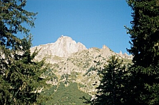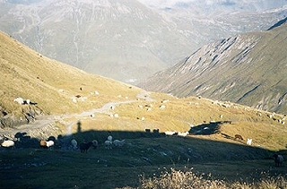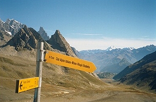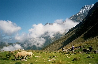 The hike up to the col was very difficult. Although the book indicated that there were magnificent views to be enjoyed, my eyelids were doing little to keep the sweat from my brow from running into my eyes and blurring my vision, so I couldn't appreciate the view. I reached the col at 6:00 PM where a sigh indicated that La Fouley was 2 1/4 hours away. The trail descended gradually and I was anxious to continue on. The col is the boarder between Italy and Switzerland and since I had always harbored a secret desire to yodel in the Swiss Alps (and no one else was around) I decided to yodel as I walked down the trail. I was unable to get my voice to bounce off the opposite mountainside, but I did get an immediate round of booing for my efforts (which actually turned out to be an enormous herd of sheep baahing). |
