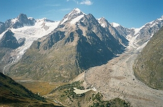 Breakfast was at 7:30 AM and I was on the trail before 8:00 AM. The trail started at the base of the Bellevue Tram Station and followed a dirt road up 660 m to Col du Voza, then another half hour beside a cog railroad to Bellevue. At this point, it branched off to the right clinging the mountainside for another hour towards the Bionnassy Glacier. The trail cut down into the valley to cross the river running out of the mouth of the glacier, then back up the mountain on the opposite side. I didn't pass one single person on my ascent (although there were a couple dozen who passed me!). |