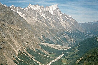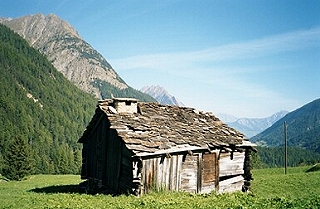 I was reluctant to give up the 400 meters I had just gained and thought that since there were well worn trails heading in the general direction I wanted to go, prehaps there was another route over the Grand Col de Ferret, which I could clearly see in the distance. I continued up the path, which quickly became a ledge clinging to the side of the cliff with a 100-meter drop into the torrent below. Twenty minutes later I could see buildings at the head of the gorge, but still could not see any trails on the other side of the gorge that would take me up over the Col. Another twenty minutes of hiking and I finally realized that there was no other route over the mountain and I started retracing my steps down the cliff face, and then down the 400 meter hillside to Arunva, where I located the correct trail on the map.