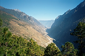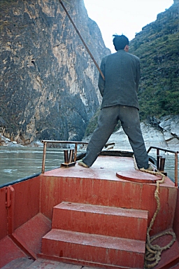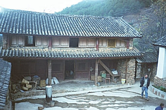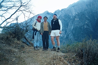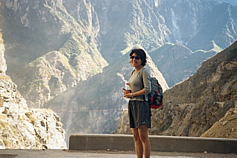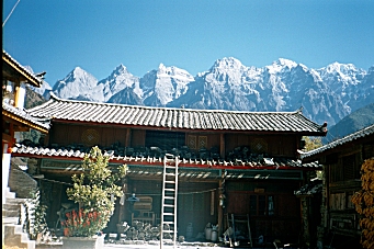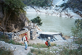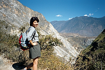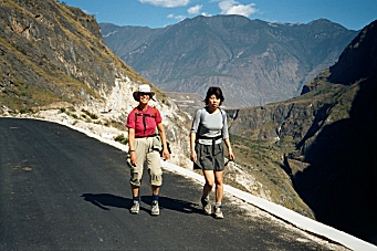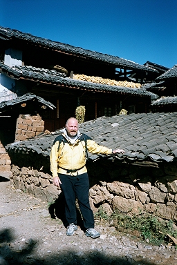 We came back to the Guan Fang Hotel in the afternoon and played ping-pong for an hour. We walked to the supermarket and purchased food for our hike tomorrow, and then got dressed to go back to the ancient town for dinner and a musical performance. At 5:00 PM we took a taxi to the Ancient Town and walked around for a couple hours before sitting down at a little restaurant near the river for dinner. We saw a westerner looking at a map of the Tiger Leaping Gorge and found that she was planning to hike the gorge tomorrow also and did not know how to get there. We told her of the bus we were taking and made arrangements to meet here at the bus stop tomorrow morning. At 8:00 PM we went to a musical performance of Naxi Ancient Music. This turned out to be a fabulous concert by a musical group, which has been in existence for 447 years! They perform music from the 16th century on instruments that were in use during that time period. Many of the members of the group are in their eighties. The group’s leader is Xuan Ke who was 73 but looked about 50, even though he’d spent 21 years in prison during the Cultural Revolution. He spoke for about 10 minutes between each song and even though he spoke in Chinese, I could tell he was very funny. The concert was over at 9:30 PM and we went back to the hotel to pack for our trip. Wednesday, November 27, 2002 – Tiger Leaping Gorge, Yunnan Province, China