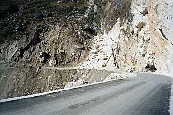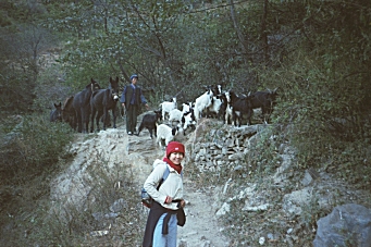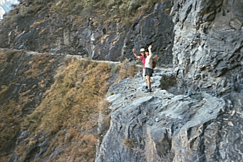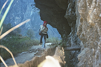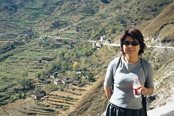 The ascent of the other side was another 700 meters up, and then we walked about 5 km along a new paved road, stopping at Sean’s Guest House for some tea. Another 2 km at Tina’s Guest House, there was much blasting and construction of what looked to be a suspension bridge. The road had been washed out here in a large and recent avalanche making vehicular traffic non-existent. We left the road at this point and headed up the mountainside. The ascent from this point grew in difficulty but Cindy did a good job. At 5:30 PM we arrived at Five Fingers Mountain Guest House where we decided to stay for the night.