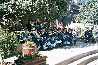Sunday, December 1, 2002 – Lijiang, China This morning after breakfast we walked to The Ancient Town so I could pass by a Bank of China and withdraw some cash from the ATM. The Bank of China is the only bank, which will accept my ATM card, and very few businesses in Lijiang accept credit cards. I need to withdraw the maximum allowance from my account each day in order to have enough money to pay the hotel bills and get airline tickets back to Shanghai. We walked around the shops in the town and purchase some souvenirs. Cindy dressed in a Meow Minority wedding costume and we took some photos of that and several local people dressed in their everyday clothes. We ate lunch at The Blue Papaya and enjoyed excellent Italian food.
