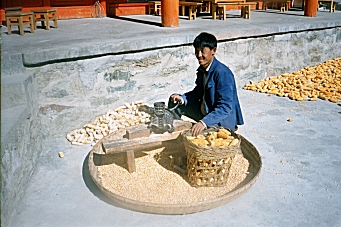 The gorge is really beautiful and I took many photographs of the huge mountains dropping down into the small Yangtze River below. There is a water trough that runs along the trail, which is sometimes made of stone and sometimes made of wood. We hiked for about four hours passing through small villages with terraced farm plots. We passed several waterfalls, one of which cascaded right over the trail. At about 1:00 PM, we reached the highest point of the trail, 2670 meters, and then began our descent via the 28 Turns, to Nuo Yu Village. There, we stopped for lunch at The Naxi Family Guesthouse, which has a wonderful view of the mountains peeking up over the rooftops. The family had just harvested the corn crop and was in the process of separating the kernels from the cobs. We determined that there was a 4:00 PM bus back to Lijiang and since we had at least an hour and a half to go, we left the Naxi house at 2:00 PM to finish our hiking. The trail down was good, but it took us two hours to reach the bottom. Hanna raced ahead to try to keep the bus from leaving without us, but as it turned out, we found a private car, which we were able to charter for 100 Yuan ($12.00) for the 2-hour trip back to Lijiang. We got back to the city at 6:00 PM and dropped Hanna off at the entrance to the Ancient Town where she was staying and continued on to our new hotel, The Jade Dragon Garden Hotel, where we planned to stay for two nights. After showering and getting some food, which we ate in the room, we fell asleep early. Friday, November 29, 2002 – Lijiang, China Today we woke up late and breakfast had almost closed by the time we got there. We ate a few things from what was left of the buffet. I went to thee business center while Cindy went to investigate tickets for a show at the hotel this evening. Our room had been very cold last night and after talking about the things we did not like about the hotel, we decided to move back to The Guan Fang Hotel. We notified the front desk of our decision to leave one day early and went back to our room to pack. The Guan Fang Hotel is located in the new section of Lijiang and has a five star rating, but with Cindy’s connections we can stay there for less than at The Jade Dragon Garden Hotel. We did some laundry in the afternoon, had lunch in a little storefront restaurant, and then went back to the hotel in the late afternoon. We slept through dinnertime and decided to skip it when we woke up late. Saturday, November 30, 2002 – Lijiang, China After breakfast I met Cindy in the business center and then we took a taxi to The Ancient Town where we browsed the shops and bought some gifts. We had lunch in a restaurant, which featured special dishes including Fried Bee Cocoons, Fried Bamboo Worms and many other unbelievable delicacies. We ordered bamboo shoots without the worms.