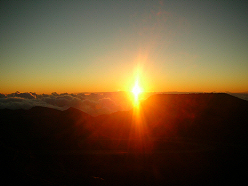 gushing about 50 feet. Further along, the road becomes a narrow one-lane way with many blind curves. My guidebook said it became gravel at this point, but apparently it has since been paved. Several times I had to stop and back up as I met oncoming traffic, and vice versa. When I reached Waihee Ridge, I parked and hiked up the Waihee Ridge Trail. The trail ascends 1500 feet in 2 ½ miles up into the clouds where I could not see anything. After an hour and a half I reached the top and then headed back to the car and drove back to Lahaina. On Friday I had to check out of Lahaina Shores, so after doing some laundry in the morning. I headed over to Haleakala National Park. It is probably 35 miles from Kahului to the 10,023-foot summit. I planned to camp in the park for the next two nights and stopped at Hosmer Grove to set up my tent before continuing on to the summit. The top of the mountain was socked in with clouds and there was not much of a view. One of the popular activities here is to take a van to the summit and then ride a bike down the mountain to the bottom. A few diehards actually ride up the volcano and I met one named Benny who had arrived earlier and was dreading the long cold ride down. He jumped at my offer of a ride back to Paia where he had left his rental car. Benny told me his bike weighed about 12 lbs and cost several thousand dollars! After picking up some provisions for the next couple nights, I returned to my campsite and spent the rest of the evening reading. I had planned to get up to see the sunrise at the summit of Halekala on Saturday morning but was surprised to hear other campers in the area packing up to leave at 4:00 AM! Not wanting to miss anything, I threw together what I needed for the day and headed up with everyone else. Parking at the summit is limited to about 50 cars and it was half full when I arrived. The sun didn’t come up for another couple hours, but at least I had a great parking spot.