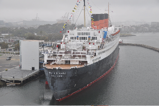 look down on the Queen Mary, which is permanently docked in Long Beach and