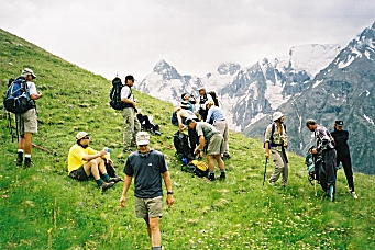 Friday, August 9, 2002 After breakfast we packed our gear for a two-day climb. We didnt leave the lodge until 10:30 AM and took the bus to the same drop off place as the previous two days. Uri had arranged for a half dozen porters to carry our group gear (tents, food & kitchen equipment). Julie, whose knee had improved a little, hired a porter for $10 to carry her pack and give her knee one more day of rest. We started hiking at 11:15 and within fifteen minutes encountered the boarder guards between Russia and Georgia. These were Russian guards and although the boarder is several kilometers away, this was the official checkpoint where our passports were examined. There is a possibility that we may walk along the ridge that separates Russia from Georgia tomorrow, but it is too high for anyone to bother us at that point. It took about an hour to get through the checkpoint, which is located in the middle of the woods. Our Russian guides warned us against photographing Border Guards.