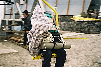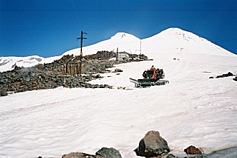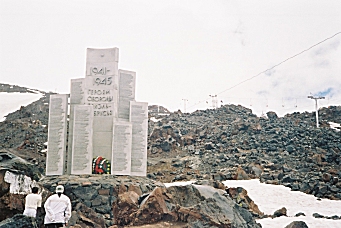 The climb down was slower than I expected. We continued with the rope teams until we reached the bottom of the glacier. By 7:00 PM we had reached camp where we packed up and continued another two hours to the valley where we got on the bus and headed back to the lodge. Most of us carried our heavy packs down the rest of the valley, the only exceptions being Julie who was still nursing her knee, Leila and an unnamed Canadian Advocate who each hired porters. After unpacking and a shower we had dinner at 10:00 PM then went to bed. Saturday, August 11, 2002 We checked out of our lodge after breakfast and took the bus to Treks, where we would start our climb of Mt. Elbrus. There, we boarded the first of two gondolas that took us from 9,000 feet to 11,000 feet. At the top of the second gondola, there is a memorial to the hundreds of Russians that died trying to retake Mt. Elbrus from the Germans in WWII. Uri explained that Russian troops were ascending the glacier using clouds for cover when a sudden wind blew the clouds away, exposing the Russian troops to German machine gun nests hidden in the rocks above.