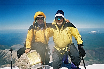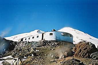 Lunch was ready when we returned (chicken or duck pate sandwiches with tomatoes and cucumbers and chicken soup). We are planning to go to bed early & wake up at 2:00 AM for our first summit attempt tomorrow. Thursday, August 13, 2002 Wally had convinced me to start taking 125 mg of Diamox every 12 hours starting yesterday. I had not used Diamox on Denali and had hoped to avoid it this time, however, our rapid mechanical ascent meant that our acclimatization was not as reliable as I had experienced in Alaska when we had hiked the entire route over two weeks. Our snow-cat was rescheduled from 3:00 AM to 4:00 AM so we got up at 2:45 AM, ate breakfast and got dressed. The snow-cat will take us just short of where we hiked up to yesterday, the base of Poshnikov Rocks. Ryan, Hyena & Donna decided to hike to the Poshnikov Rocks so they left the Refugio at 2:00 AM. Our snow-cat passed them about 500 meters short of the Rocks, so we started climbing without them, knowing they would catch up soon. There were probably 200 people on the mountain at 4:00 AM all going for the summit. Everyone had headlamps and it was difficult to tell the headlamps from the stars in the sky. The weather was perfect (for the second day in a row), except for some wind that forced us to hike in down jackets for the first few hours. The sun came up at 5:30 AM and we stopped to put on sunglasses and sun tan lotion. We reached the saddle between the east and west summits at 9:45 AM and took a break before heading up the west summit, the highest point in Europe at 5642 meters. The east summit is 18 meters lower than the west summit. As we started up the west peak, the sun was blazing and we had to stop to strip down to a single layer of clothing. I think Ryan would have peeled away his skin if he could.