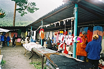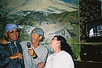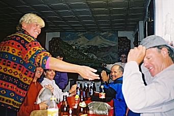 Thursday, August 15, 2002 Last night it rained heavily and there was thunder and lightning. I got up early and went for a run up the road to a little village where people were walking their cows and feeding their chickens. The village looked like the set from Fiddler on the Roof. Every house was either under construction, under repair or should have been under repair. I got back to the lodge at 7:45 AM and had breakfast. Wally covered the tipping guidelines for our Russian staff, which he will pass out at our farewell dinner tonight. The news is full of pictures of the flooding in Eastern Europe, particularly Prague and Germany where I was hoping to visit in the next few weeks. I may have to alter my itinerary to avoid distressed areas or areas that are closed due to flooding. Wally has encouraged me to climb Mt. Blanc in southern France and I need to investigate that possibility as soon as I get to Helsinki on Saturday. At noon we boarded a bus which took us to a local market where we browsed the various stalls for woolen goods. It started raining so we abandoned the shopping and went to a local karaoke bar for lunch. Nadia, our cook from Mt. Elbrus, was there entertaining another group of local tourists on the karaoke system, and it didnt take too many drinks for many of our group to join in the fun. After watching Alex & Jack sing Stand by your Man and Larry, Hynek, Ryan & Alex attempt YMCA I began thinking that I should investigate a different sport.