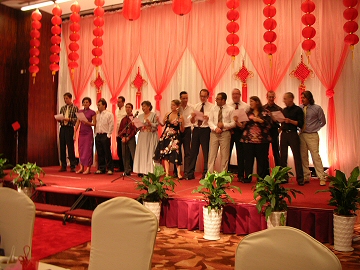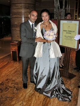 parents home where wedding plans continued in earnest. Wednesday, Cindy and I went to a local photography studio to have pictures taken for our wedding. We spent ten hours in the studio, including four changes of clothing and a three-hour trip to the ancient town of Longmen with a five-person crew to take photos in Wu-Dynasty costumes. It was very hot, and the day was very long, but the photos came out pretty good so it was worth the trouble. Thursday was an open day but in the evening, all the French guests gathered in the hotel lobby and we walked down the street to a restaurant where Hua’s parents were hosting a welcome dinner. The number of dishes served was endless, and there was much drinking, toasting and singing. Many of the guests went out to a bar afterwards, but I returned to the hotel. Friday, September 26th was the wedding day of Jerome & Hua. They had chosen to have a traditional Chinese wedding, which began with a costumed matchmaker announcing Jerome’s entrance to all the guests who had assembled at his home, which in this case was the hotel lobby. Jerome wore a Chinese wedding costume and hat. After a half hour of the matchmaker extolling Jerome’s virtues, he exited the front of the hotel and mounted a white horse, which would transport him to the home of Hua’s parents where he would pick her up and bring her back to the hotel. Watch the Video Following Jerome was the sedan chair, carried by four bearers, and an eight-man band, that played continuously as we all strolled through the streets of Fuyang. We attracted considerable attention. When we reached Hua’s home, the entire wedding party of about 35 people, squeezed into their living room, where a ceremony symbolizing Hua leaving her parent’s to join with Jerome took place. The matchmaker served a wedding dessert containing sweet and sour ingredients, which symbolized the ups and downs the couple will experience in their lives. Watch the Video Our friend Fei struggled to translate the matchmaker’s stylish Fuyang dialect into French for the benefit of the guests. Hua’s Uncle then carried her down six flights of stairs to her waiting sedan chair, and Jerome remounted the horse. The rest of the wedding party climbed into fifteen rickshaws and we all rode back to the hotel while fireworks exploded all around. All during the procession, the matchmaker continued to announce all of Jerome & Hua’s virtues and what a wonderful married life they will have together. At the hotel, Jerome dismounted and collected Hua from the sedan chair, tied a ceremonial rope around her and led her up to their suite. Here the wedding party sealed them in the room and disbanded.