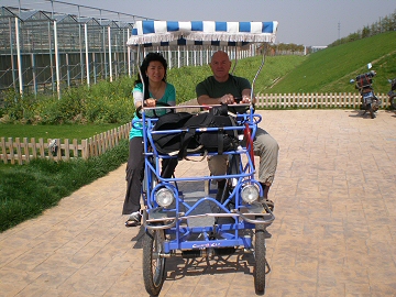 I had read an article about the Shanghai Urban Vegetable Garden so we hired a taxi to drive us an hour south to visit this newly opened private business. The facility covers 5000 acres and includes five huge greenhouses where fruits and vegetables are grown for sale to large restaurants and food stores. We rented a 2-seat peddle-power car to travel throughout the complex and spent several hours roaming through the various crops, many suspended from bamboo scaffolding. In one section, tomato trees produce up to 10,000 tomatoes each year. I got many great ideas to share with my Dad for use in his garden.