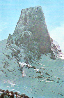stopped for lunch. In the afternoon we started climbing up a different gorge, created by the Rio Bulnes to the picturesque village of Bulnes. After a break, we continued up to the Collado Pandebano, over the ridge and down to the road where Fernando was waiting with the car to take us to our hotel in Sortee. We checked into the Hotel Casa Cipriano, and were able to rest for a couple hours before dinner at 8:30 PM. Thursday we ate breakfast, checked out of the Casa Cipriano, and then took the car up to the point where we stopped hiking yesterday. At 9:15 AM we began a three-hour ascent up towards the sheer cliffs of Naranjo de Bulnes. Known locally as ‘El Picu’, the 8200 foot spire is a favorite of rock climbers all over Europe. Erik’s principal occupation is guiding climbers up this mountain and he has stood on the summit over 200 times. Fernando has been there 90 times. |