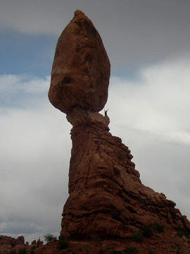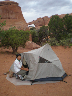 After setting up our tent, I was anxious to hike out to see Landscape Arch. The weather was worsening and I could see lightening on the horizon, but the forecast for tomorrow is for thunderstorms and I didn’t want to miss the chance to see the largest arch. Cindy didn’t want to hike in bad weather so I hiked out alone. As I approached the end of the trail, it did start to rain and the wind became gusty blowing sand in my face. But seeing the arch itself was worth the trip, and after taking a few photos, I hurried back to the car.